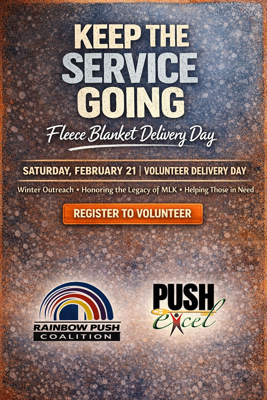 Date: Saturday, February 21Activity: Blanket delivery to community partnersRegistration Required: YesIf you are able to serve, please register using the form below so we can coordinate assignmentsand logistics effectively.