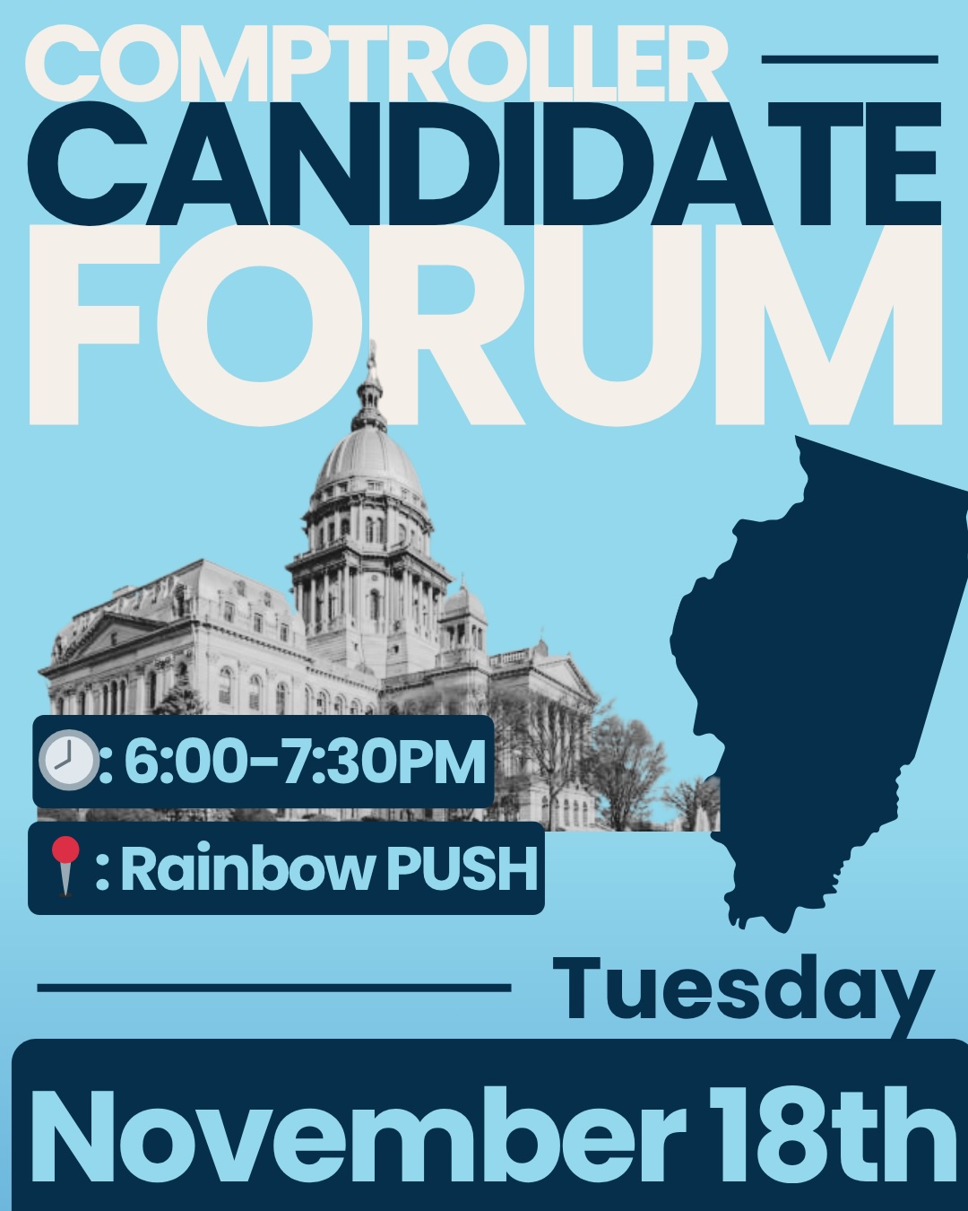 You are invited to join us for an important Comptroller Candidate Forum on Tuesday, November 18th from 6:00–7:30 PM at the Rainbow PUSH Coalition.