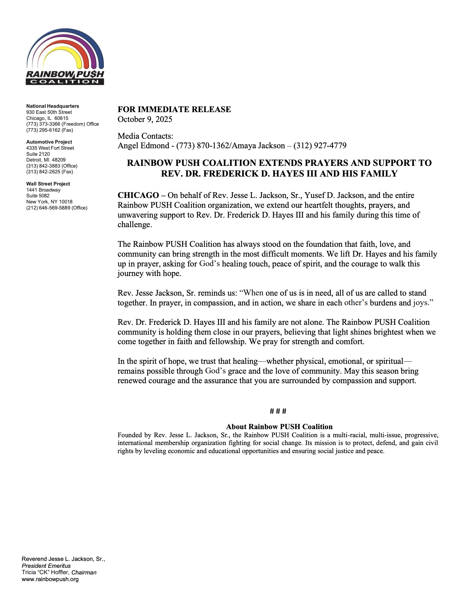 Rainbow PUSH Coalition Extends Prayers and Support to Rev. Dr. Frederick D. Hayes III and His Family