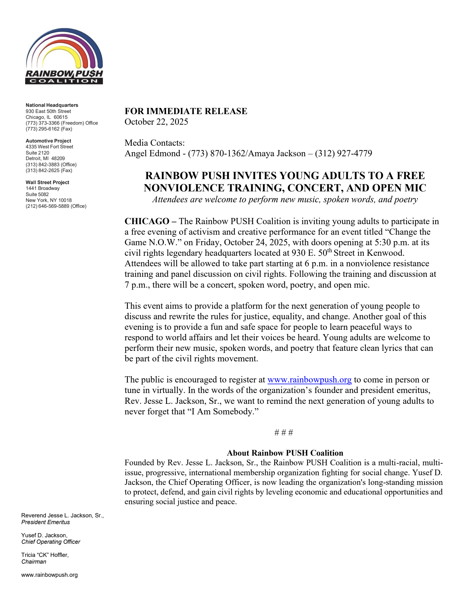 Rainbow PUSH Invites Young Adults to a Free Nonviolence Training, Concert, and Open Mic