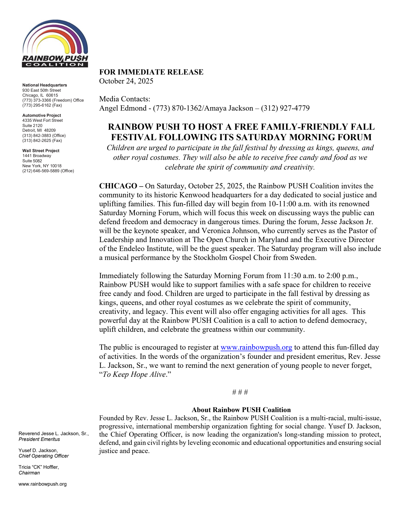 Rainbow PUSH to Host a Free Family-Friendly Fall Festival Following its Saturday Morning Forum
