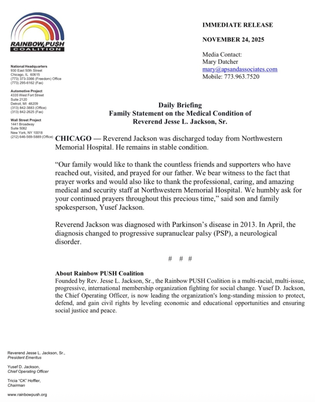 Daily Briefing — Family Statement on the Medical Condition of Reverend Jesse L. Jackson, Sr