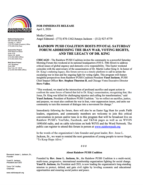 Rainbow PUSH Coalition Hosts Pivotal Saturday Forum Addressing the Iran War, Voting Rights, and the Legacy of Dr. King